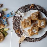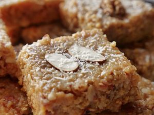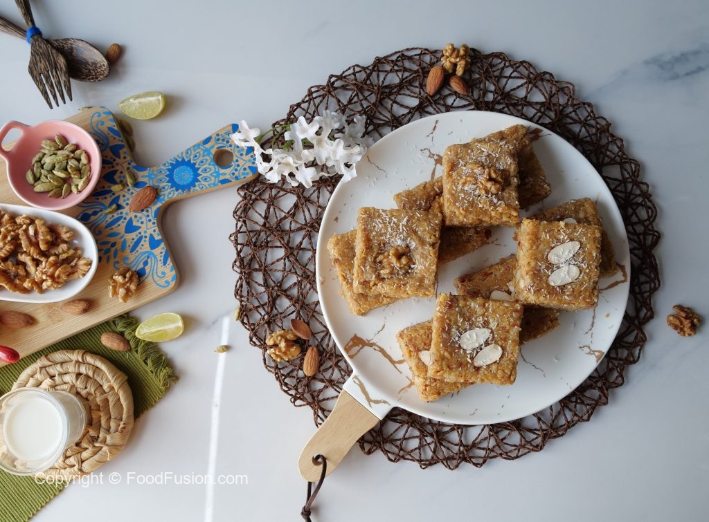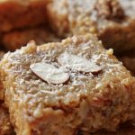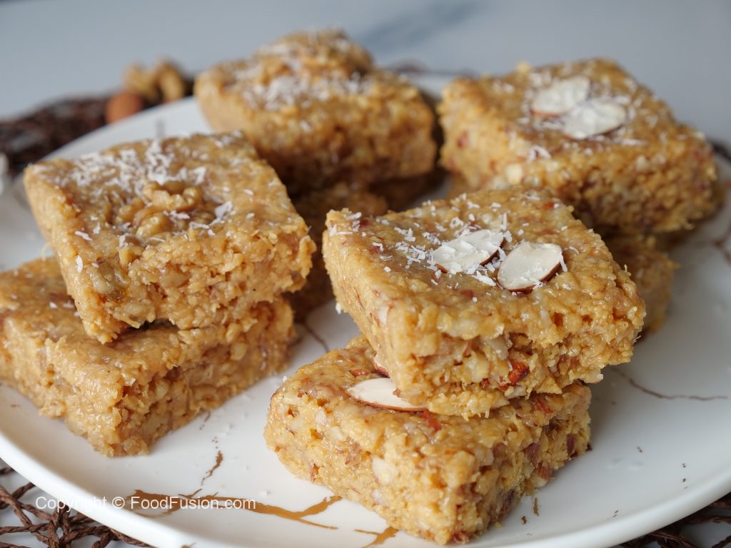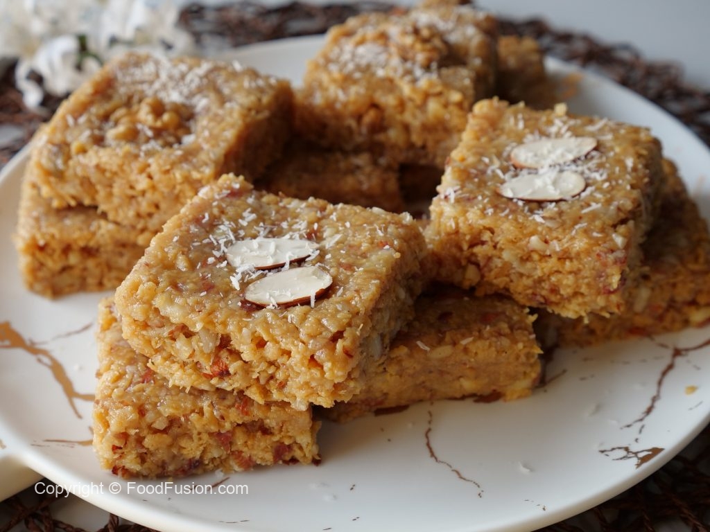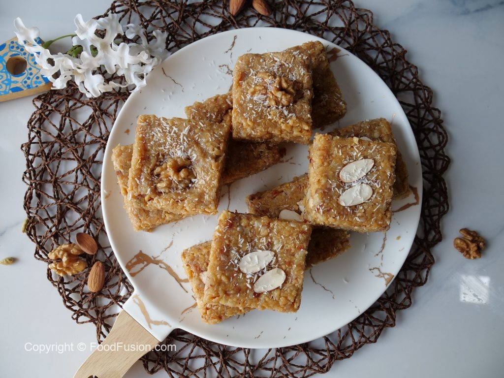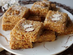 Grease 7x11” baking pan with clarified butter,add almonds halwa,walnut halwa and spread evenly.