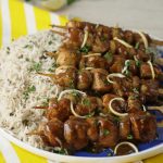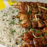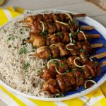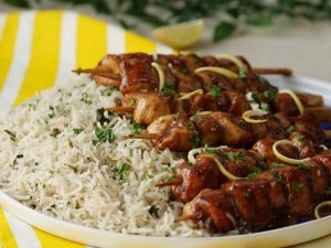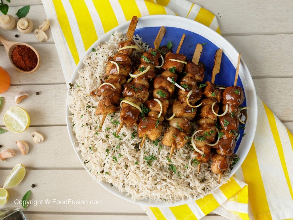 Serve lemon herb rice with chicken & mushroom skewers,drizzle prepared BBQ sauce and garnish with lemon skin,fresh parsley & serve!