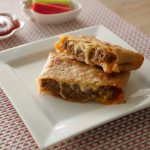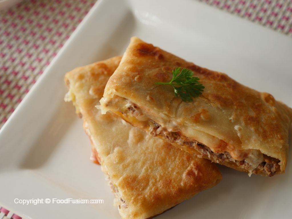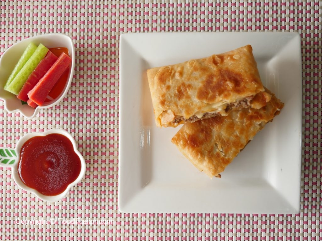 Place beef patty and fold all edges of flat bread (roti) and apply egg white to seal the edges.
