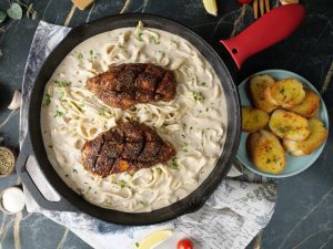 -Cast iron pan mein cooking oil dal dein aur chicken fillets ko halki ancch per dono sides sa paka lein (5-6 minutes each side) & side per rakh dein.