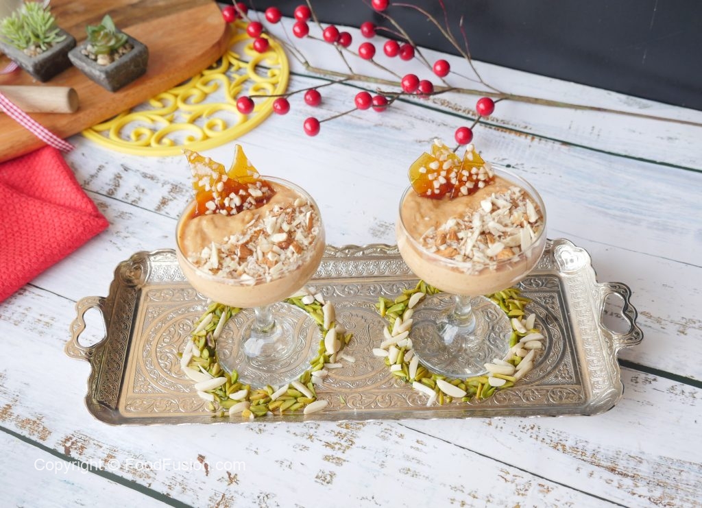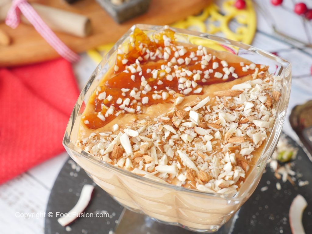 Serving dish mein caramel firni dal dein,badam aur caramel crunch sa garnish ker ke serve karein!