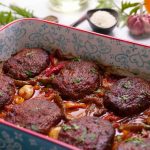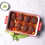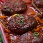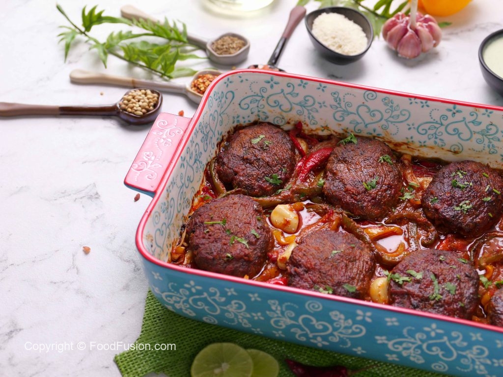 -Kebab baking dish mein rakh kar upar se tayyar sauce dal dein.