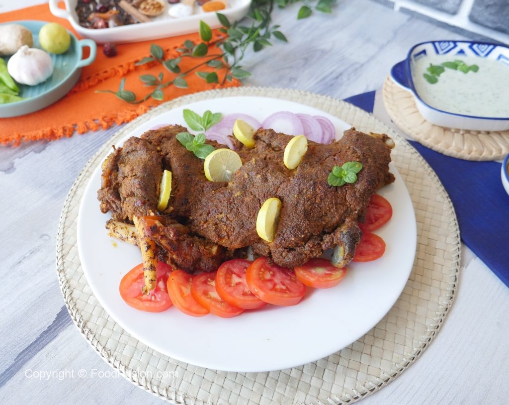 Grill mutton leg in preheated oven at 200 C for 12-15 minutes or until golden brown color appears.
