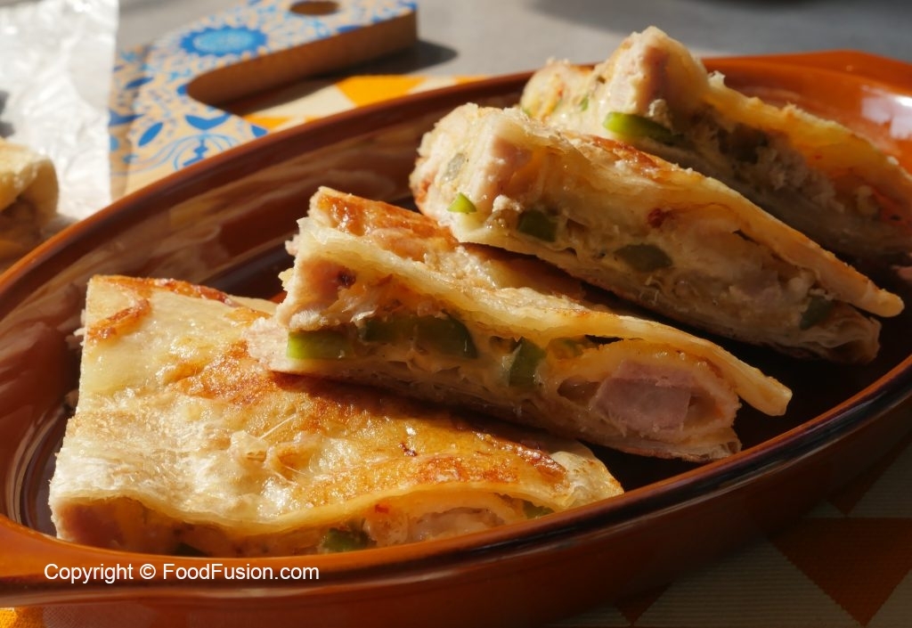 Tawa per mozzarella cheese aur cheddar cheese dal ker pheela dein,cooked paratha rakh ker upper sa cheddar cheese,mozzarella cheese,cooked vegetables,fried fish pieces,mozzarella cheese,cheddar cheese aur lal mirch crushed dal dein.