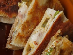Paratha ki ek side per cheddar cheese,mozzarella cheese,cooked vegetables,fried fish pieces,mozzarella cheese aur cheddar cheese dal dein.