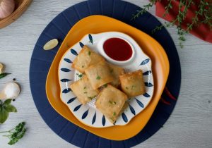 Samosa sheet/manda patti ko four equal parts/strips mein cut ker lein,ek samosa patti ko horizontal rakh dein,maida ki slurry laga phir us ka upper dosri samosa patti vertical rakh dein,plus (+) ka sign bun jaye.