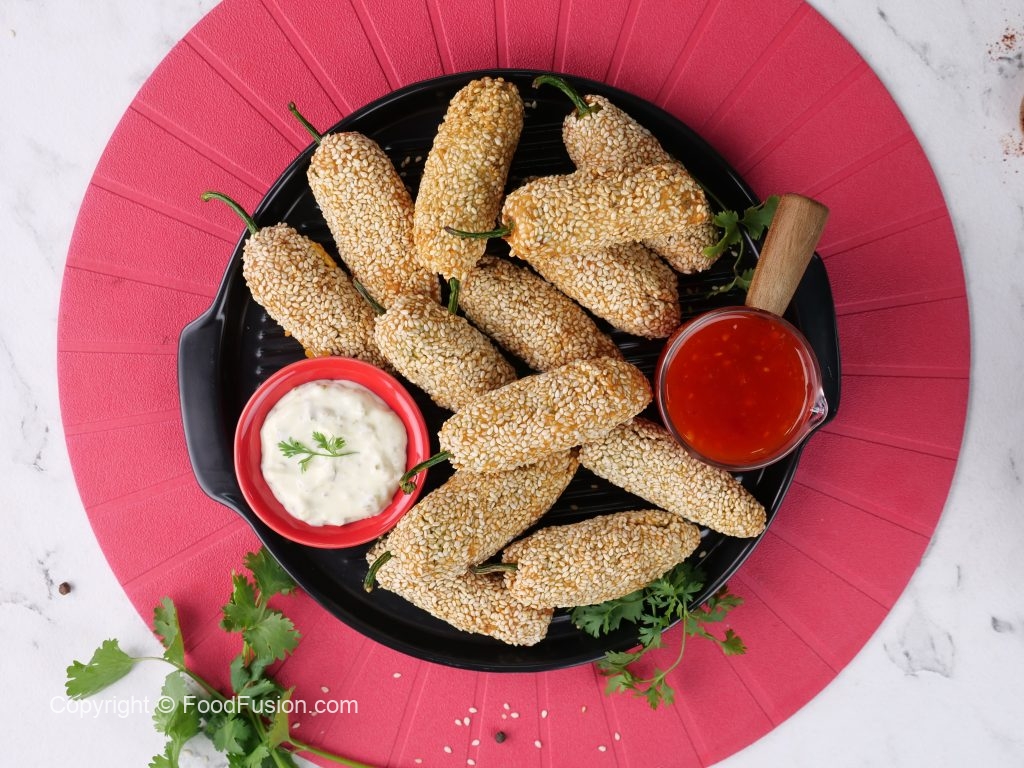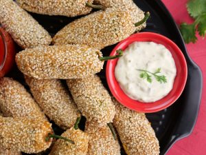 -Stuffed green chillies with prepared filling,coat in gram flour batter then coat with sesame seeds (makes 30-35) & let them rest for 15 minutes.