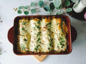 Place prepared baking dish,cover and bake in pot on medium flame until cheese melts (15-18 minutes).