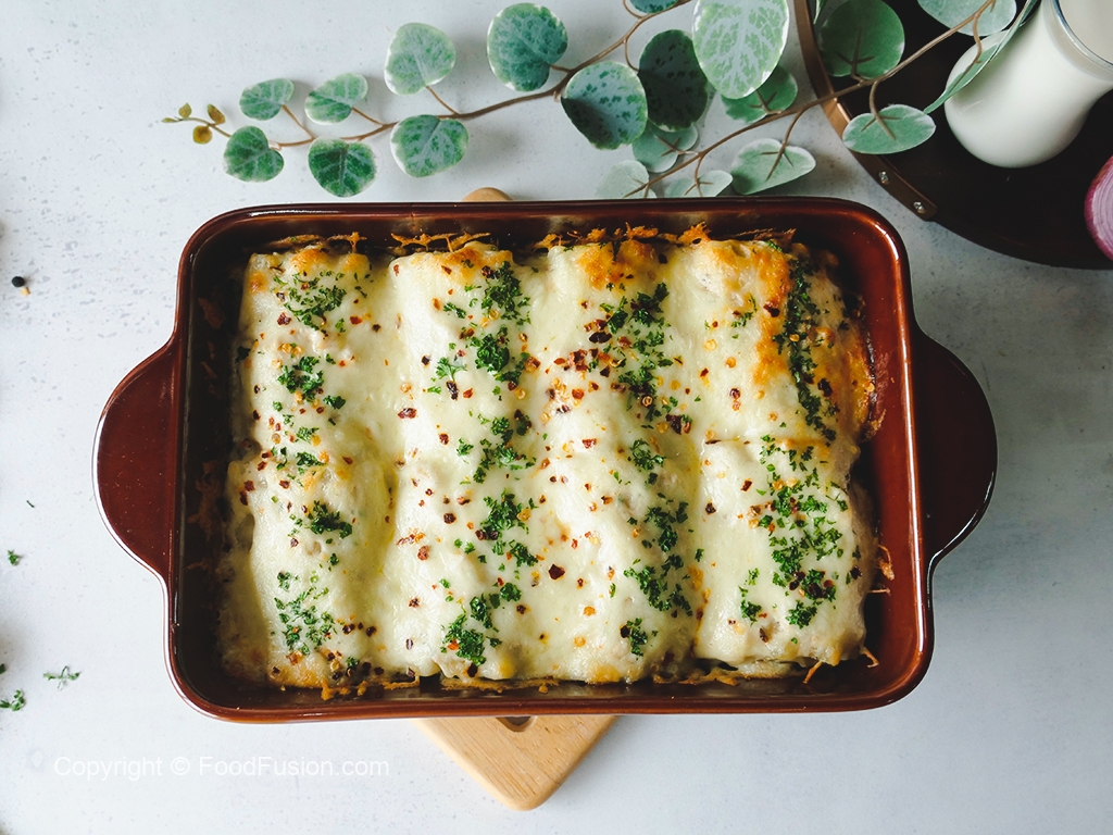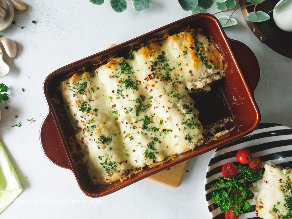 In a baking dish (6.5 x 10 inch),add & spread prepared alfredo white sauce,place lasagna roll ups,add & spread alfredo white sauce,mozzarella cheese,fresh parsley & red chilli crushed.