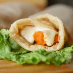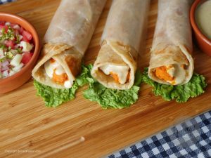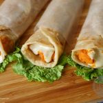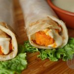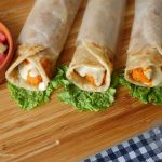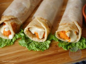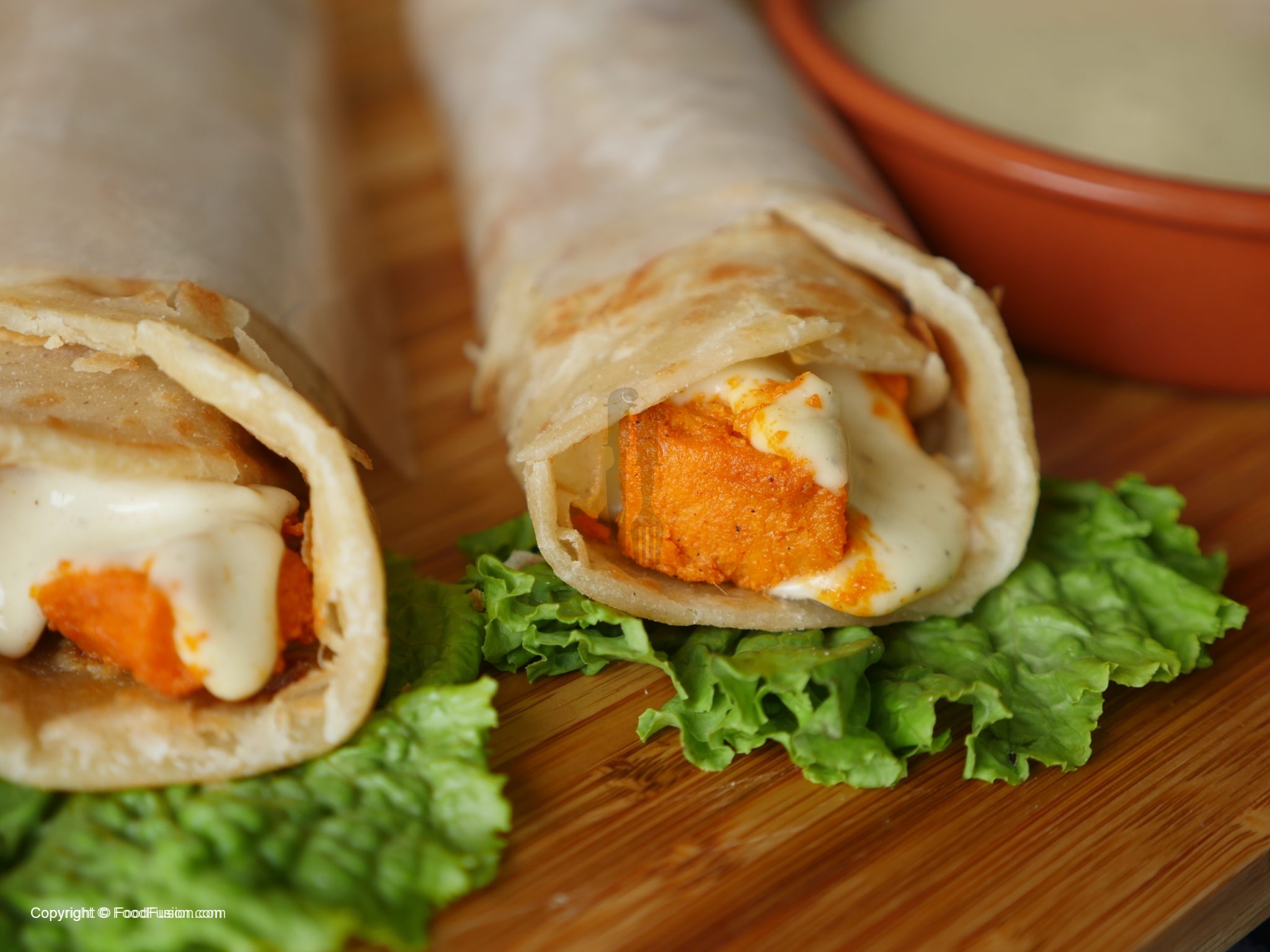 Butter paper mein paratha rakh ker cooked chicken,cream cheese aur pyaz dal ker butter paper mein wrap ker ka serve karein.