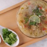 -In a serving bowl,add lemon juice,prepared soup,black pepper crushed,fresh coriander,lemon slice & serve hot!