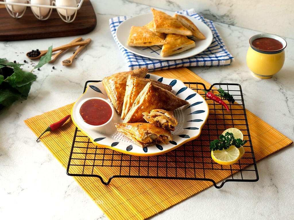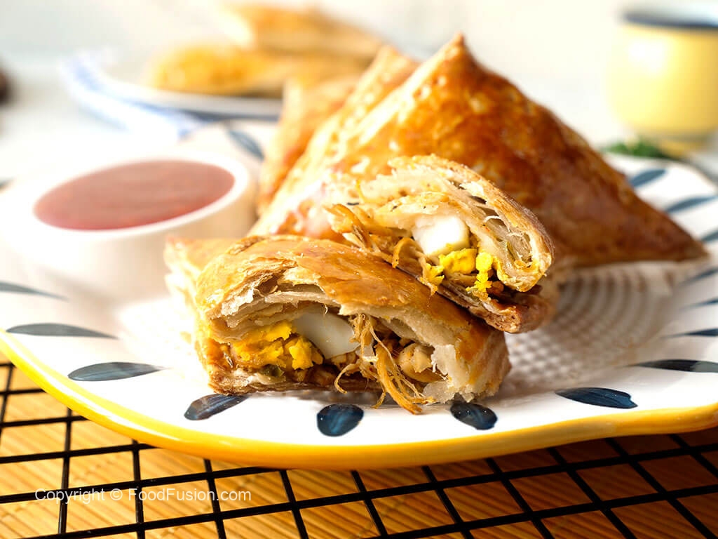 On each puff pastry square,add prepared filling & egg wedge in the center (skip egg if storing),apply water on the edges,flip the other side & press the edges to stick together and prick with fork to seal the edges (makes 18).
