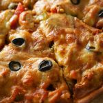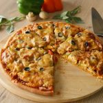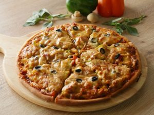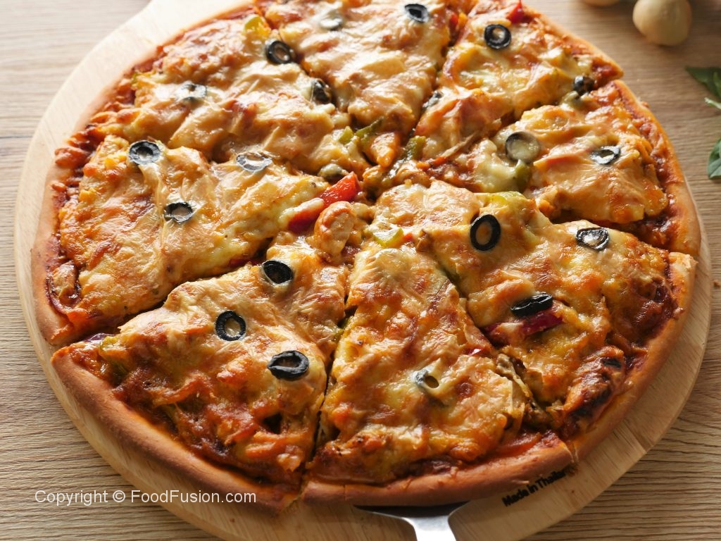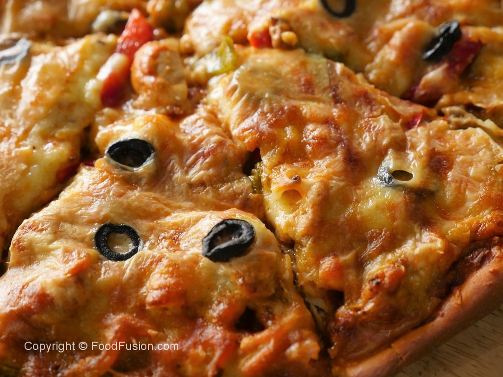 Pizza sauce dal ker pheela lein,cooked chicken filling,mozzarella cheese,cheddar cheese aur black olives dal dein (makes 2 regular pizzas).