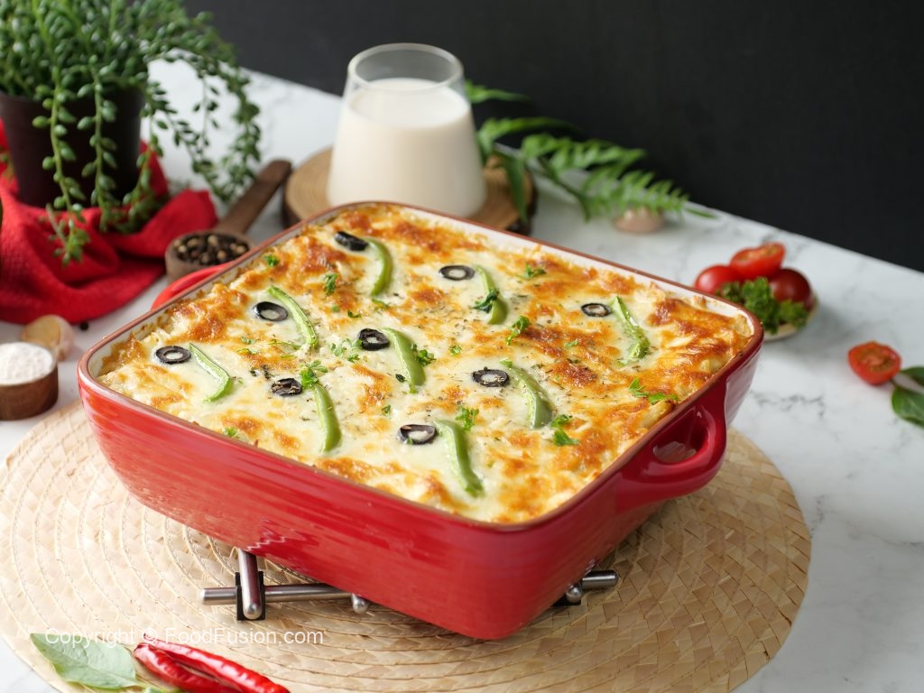 -Place lasagna sheets,add prepared chicken filling,olive oil,prepared creamy white sauce,fresh parsley,cheddar cheese,mozzarella cheese,lasagna sheets,prepared chicken filling,olive oil,prepared creamy white sauce,fresh parsley,cheddar cheese,mozzarella cheese,lasagna sheets,prepared chicken filling,olive oil,creamy white sauce,fresh parsley,cheddar cheese,mozzarella cheese, capsicum,black olives & sprinkle dried oregano.