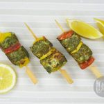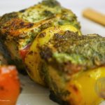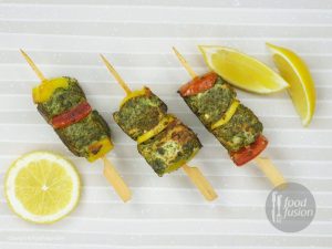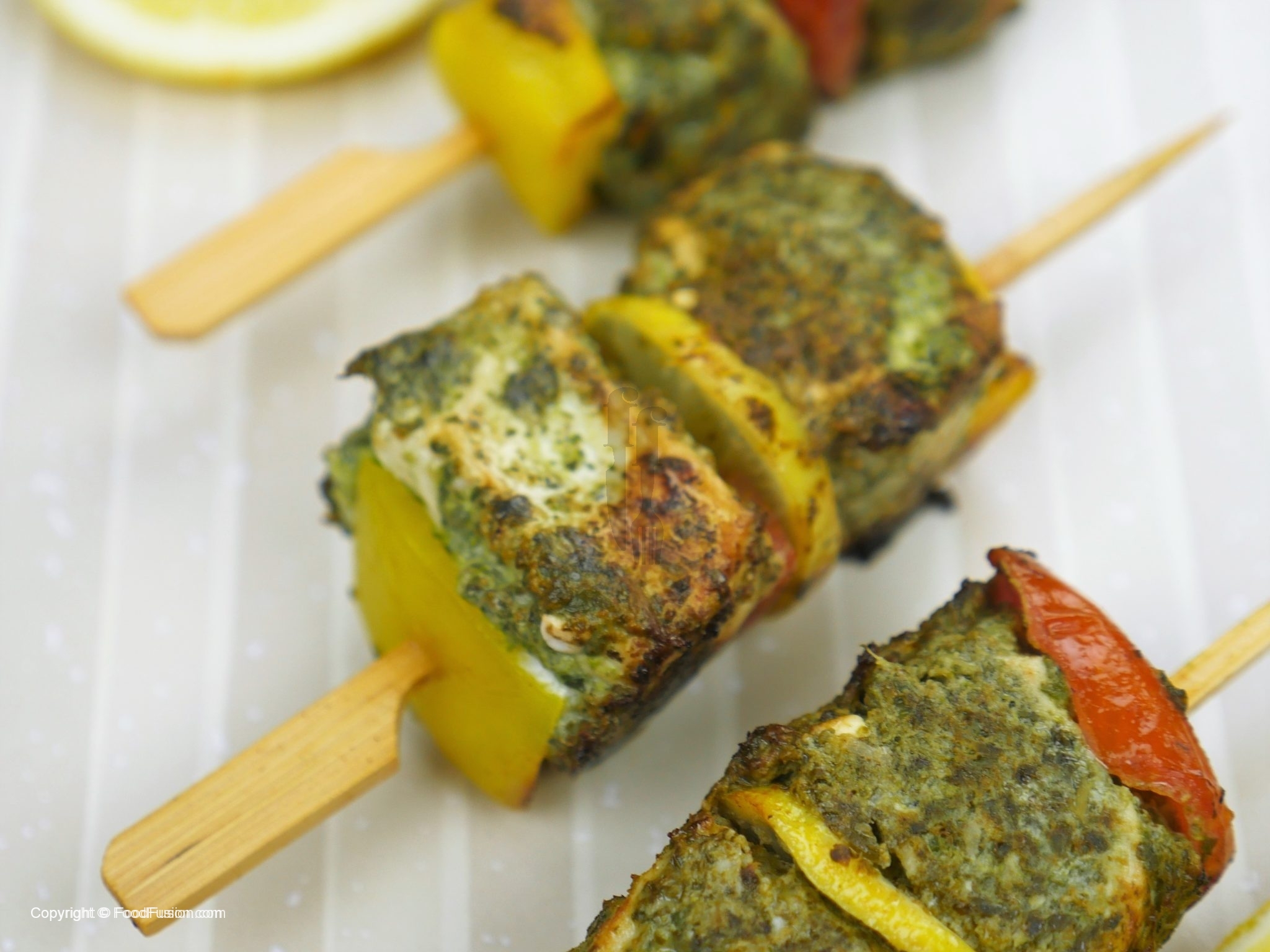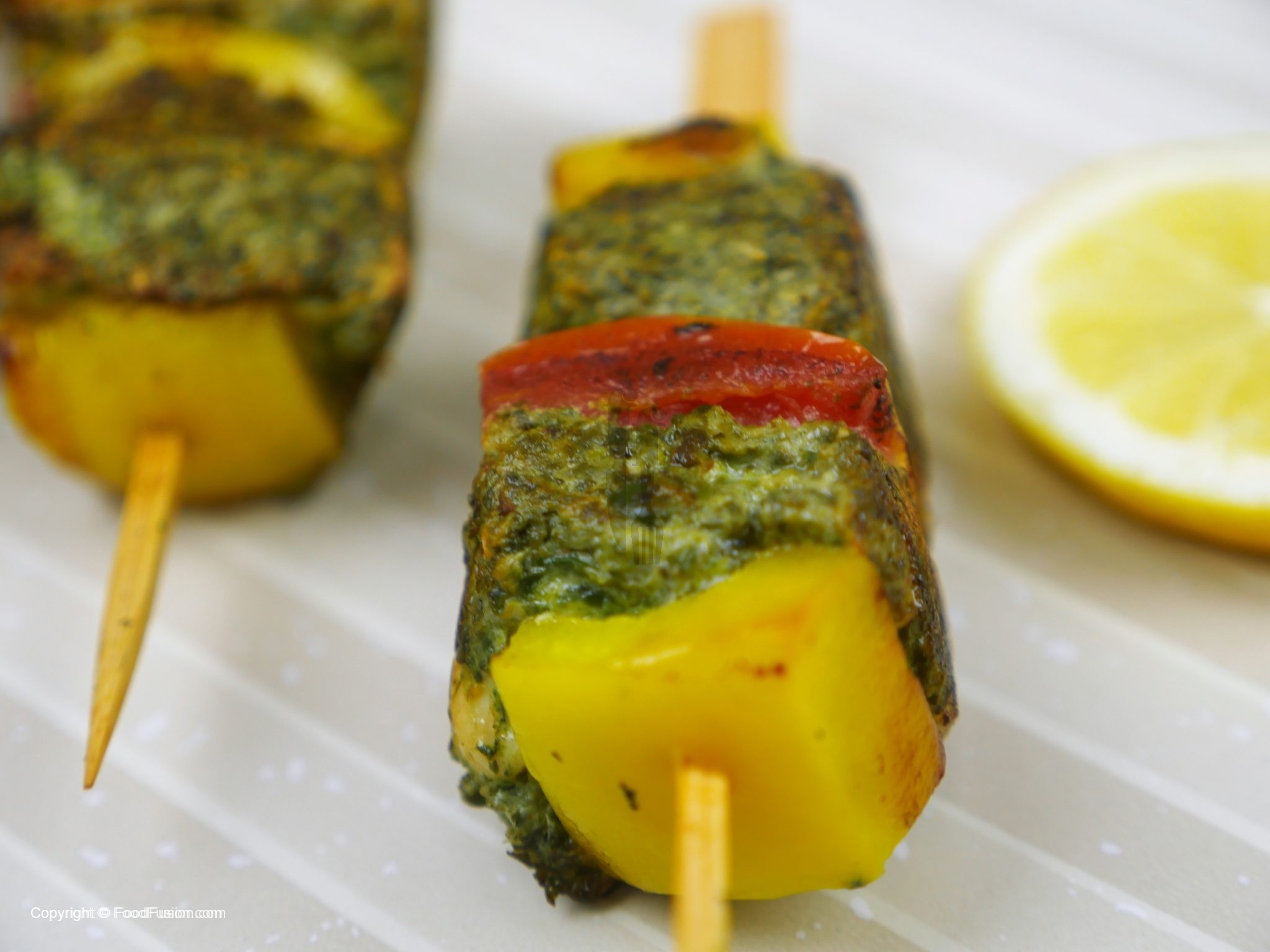 Ab marinated chicken,color bell pepper,tamatar,pyaz aur lemon slices ko skewers per assemble ker lein.
