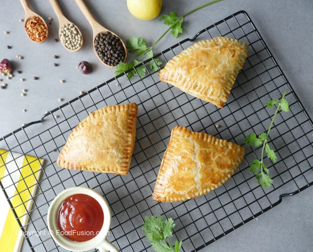 Add & spread chicken filling,place another paratha part,repeat the same layer and seal edges with fork & apply egg wash (makes 12).