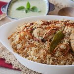 Add soaked rice,mix and cook on medium high flame until water is reduced (4-5 minutes),cover & steam cook on low flame for 18-20 minutes.