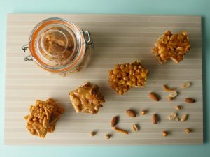 Gur syrup mein roasted bhunay chanay ker ache tarhan mix karein.