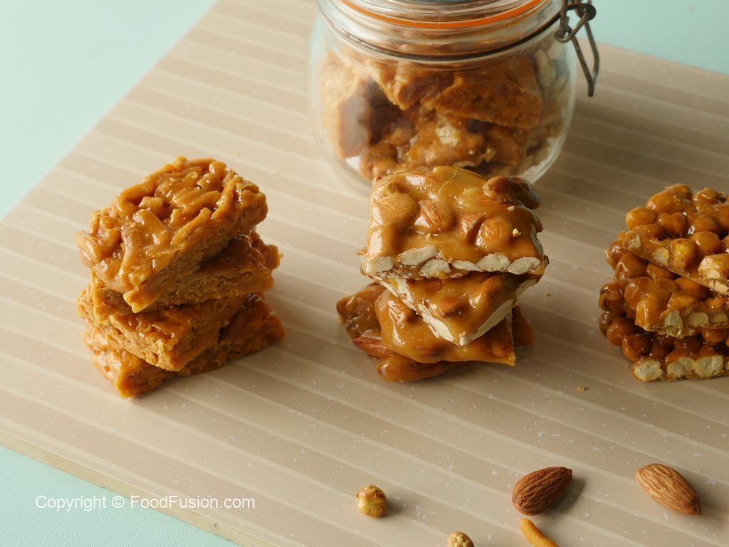 Gur syrup mein roasted moong phali ker ache tarhan mix karein.
