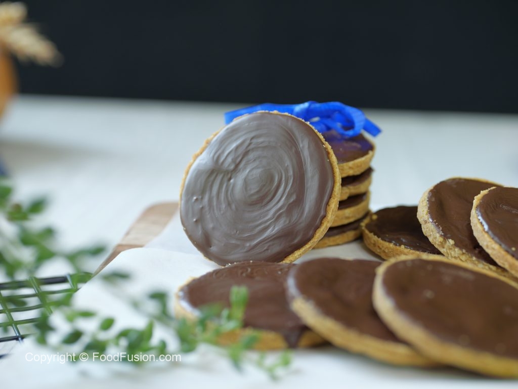 -Spread melted chocolate on one side of biscuits & let it set at room temperature (makes 28).