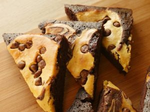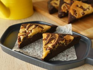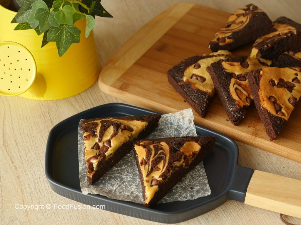 8 x 8 inch baking pan mein butter paper laga lein,tayyar brownie batter aur cream cheese batter dal dein aur skewer ki madad sa swirls bana lein.