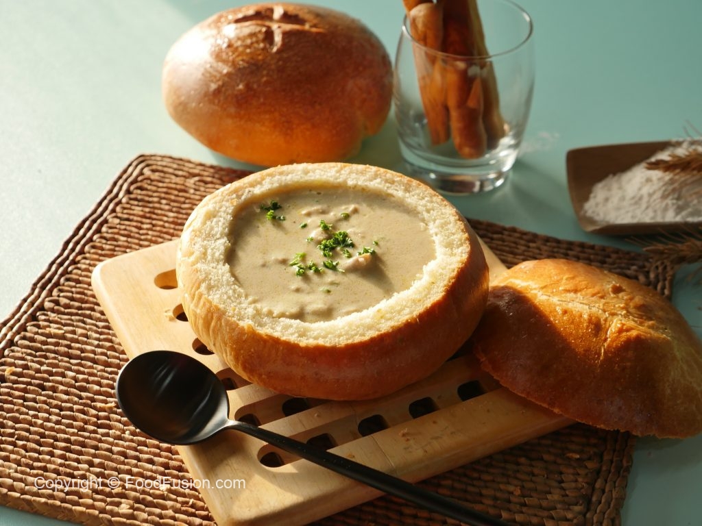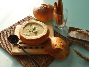 Let the bread cool down and using a knife to cut a circle out of the top of the bowls.Use a spoon to scoop out some of the extra bread so that you have enough room in the bowl for soup and reserve the bread for dipping.