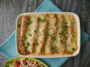Pour prepared mixture in a greased baking dish (8 x 8 inch), spread evenly and sprinkle chocolate chips & walnuts.