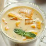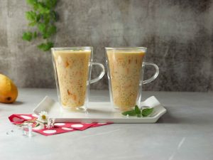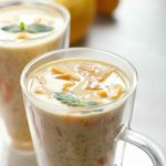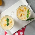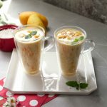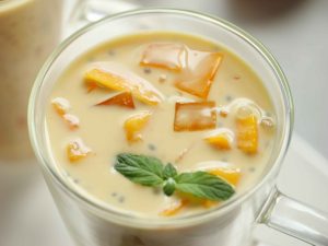 -In a bowl,add mango puree,boiled tapioca sago,mango cubes,soaked basil seeds,mango jelly,prepared creamy milk,ice cubes,mix well & serve!