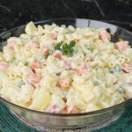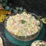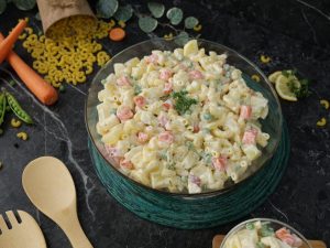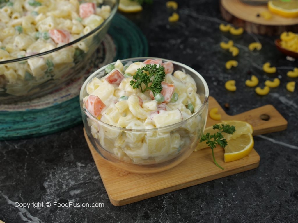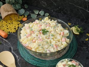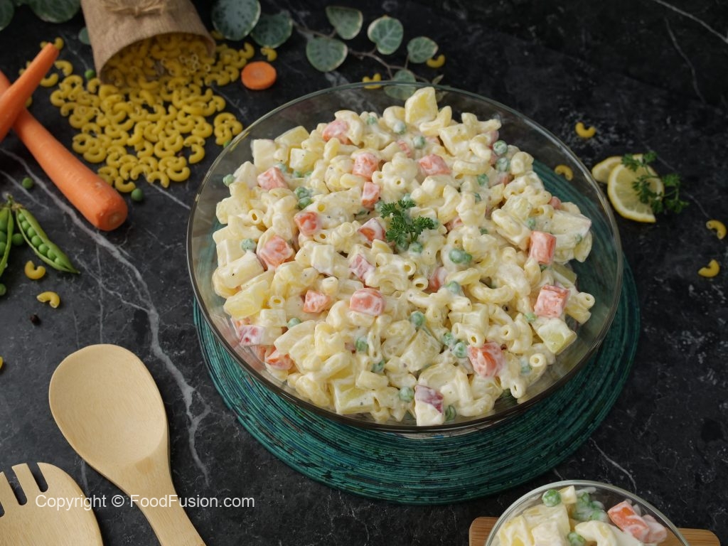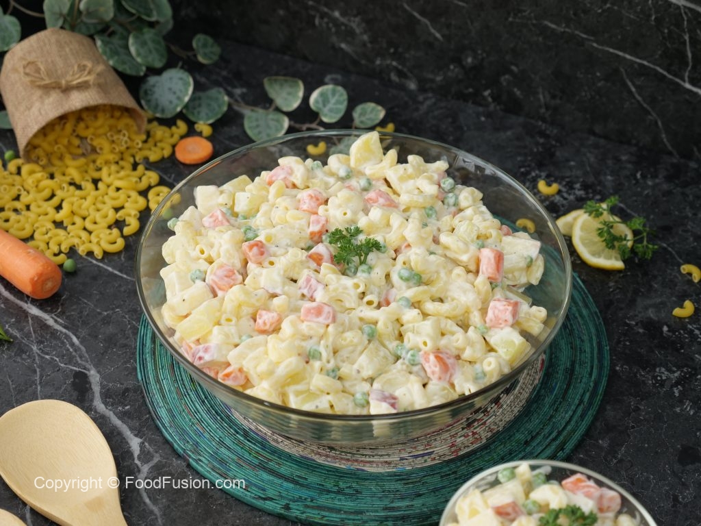 In a bowl,add potatoes,carrots,apple,peas,pineapple,boiled elbow macaroni & mix well.