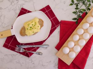 Remove the pan from the heat when the eggs are mostly set,but a little liquid egg remains.