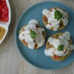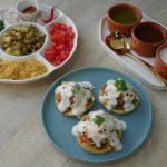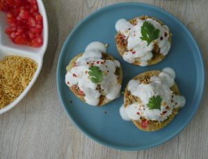 On puri,add potato+green lentil,onion,tomato,chaat masala,lemon juice,green chutney,tamarind chutney,sev nimco,yogurt,red chili crushed & serve!