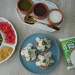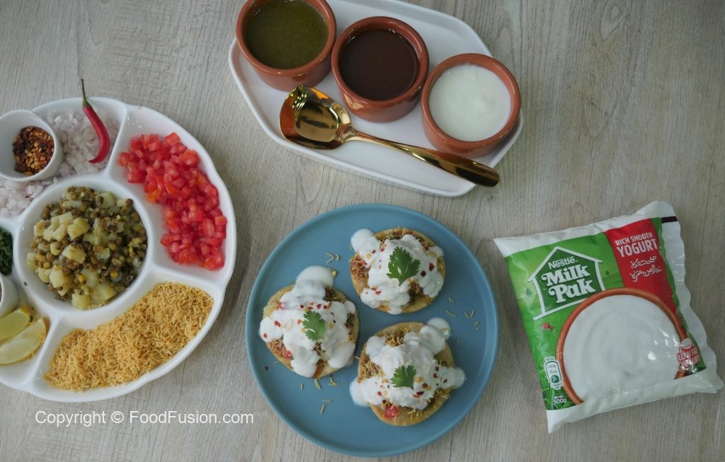 Puri per aloo+hari mong daal,pyaz,tamatar,chaat masala,lemon juice,hari chutney,imli chutney,sev nimco,dahi aur lal mirch crushed dal ker serve karein.