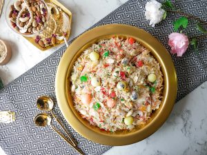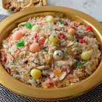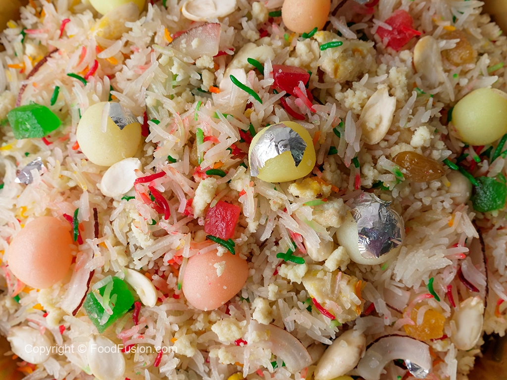 Now add stained red,green & orange colored rice then add washed & strained dry nuts.