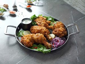 -In a bowl,add yogurt,tomato paste,ginger garlic paste,mayonnaise,kashmiri red chilli powder,turmeric powder,pink salt,chicken powder,all-purpose flour,prepared spice mix,lemon juice,cooking oil & mix well.