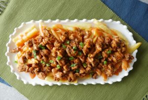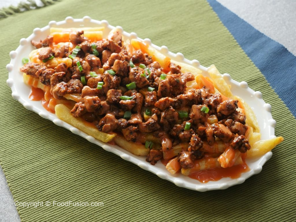 On serving platter,add potato fries,drizzle prepared sauce,cooked chicken,drizzle prepared sauce and garnish with green onion leaves & serve!