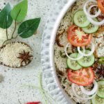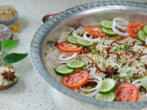 -In a pot,add 1/3rd portion of boiled rice,cooked lentil mixture,fresh coriander,green chillies, remaining boiled rice,fried onion,green chillies,fresh coriander & clarified butter.