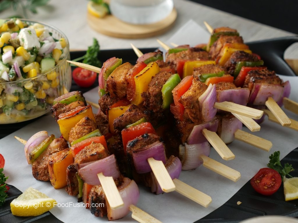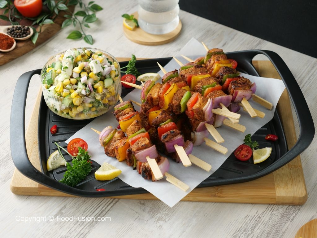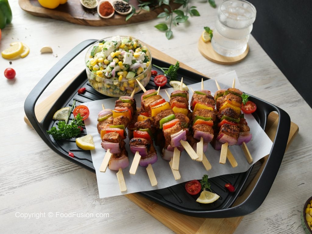 -Heat cast iron grill pan,grease with cooking oil & grill skewers on medium flame from all sides until done & brush cooking oil in between.