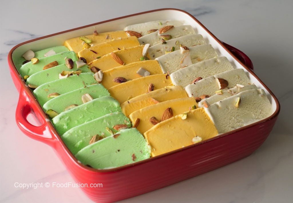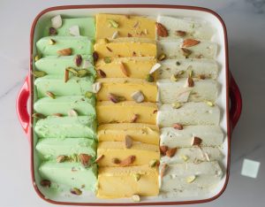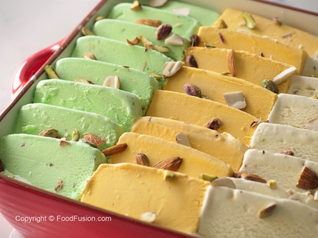 Add slices of king kulfa,mango and pista ice cream and garnish with almonds & pistachios & serve!
