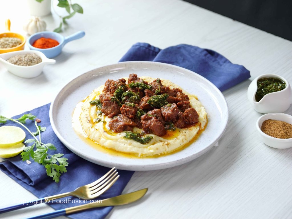 -Serving dish mein mashed potato,chimichurri sauce,fry beef boti,chimichurri sauce aur chaat masala dal ker serve karein.