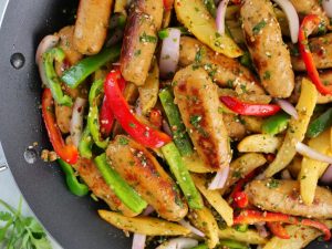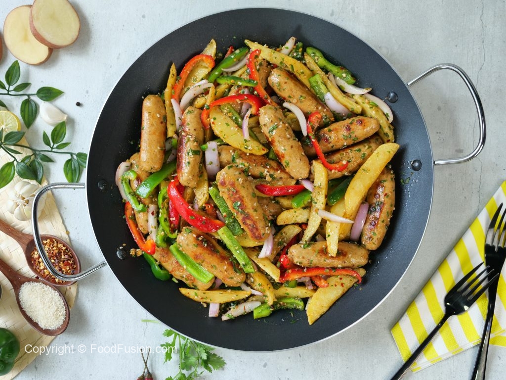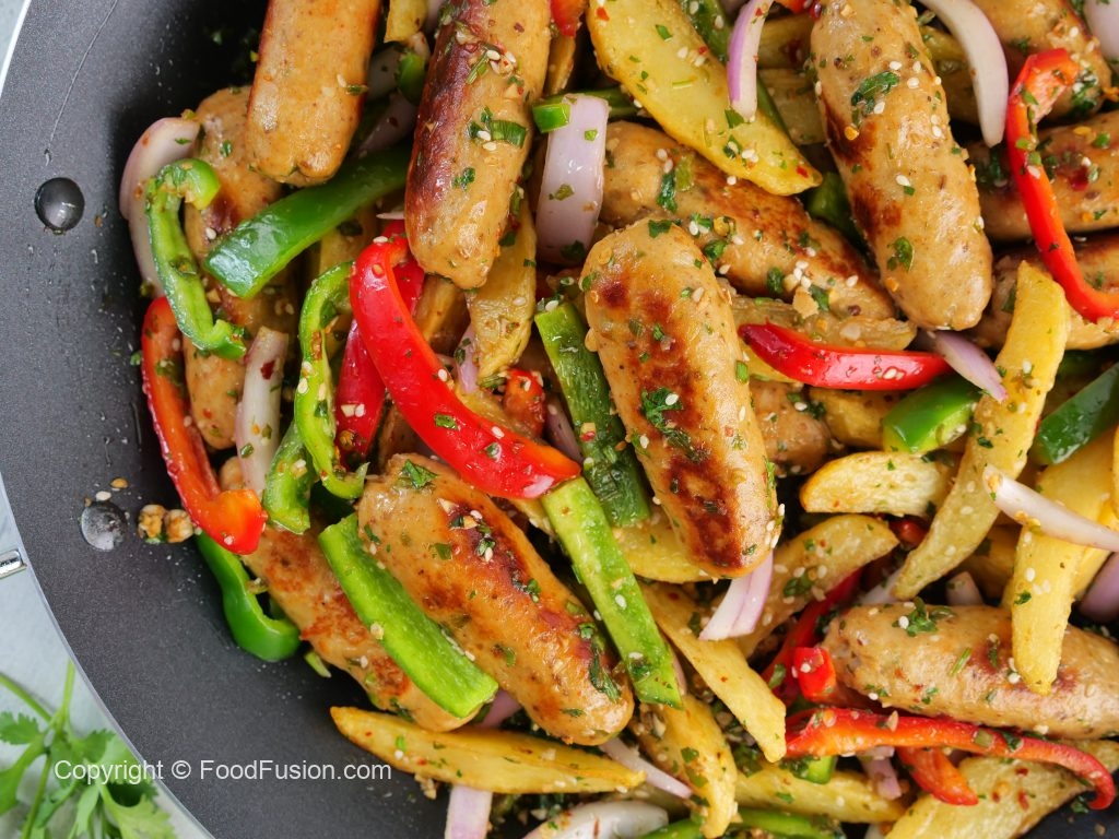 -Add red bell pepper,capsicum,onion,fried potato,fried kababs & give it a good mix.