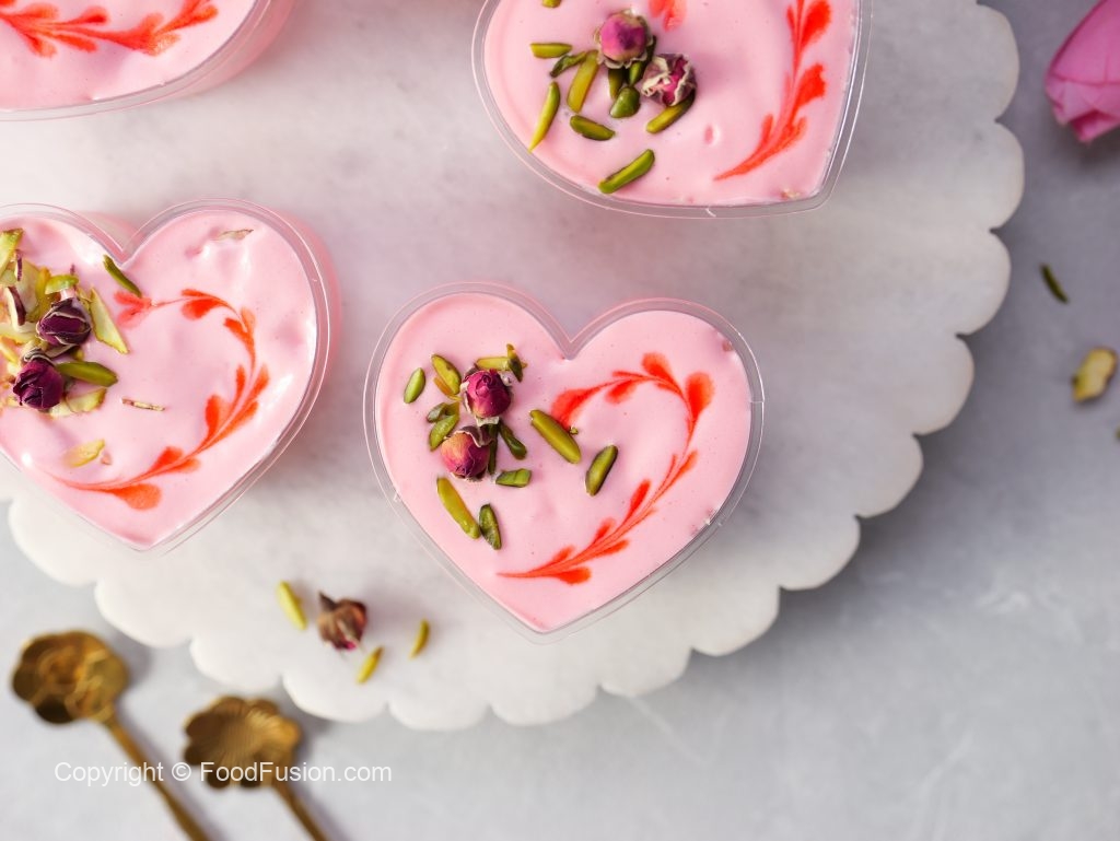 -Serving cup mein tayyar rose cream,pista,badam aur syrup coated pheni dal ker evenly pheela lein phir tayyar rose cream dal dein,rose syrup,pista aur dried rose buds sa garnish ker lein (makes 8-9).