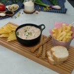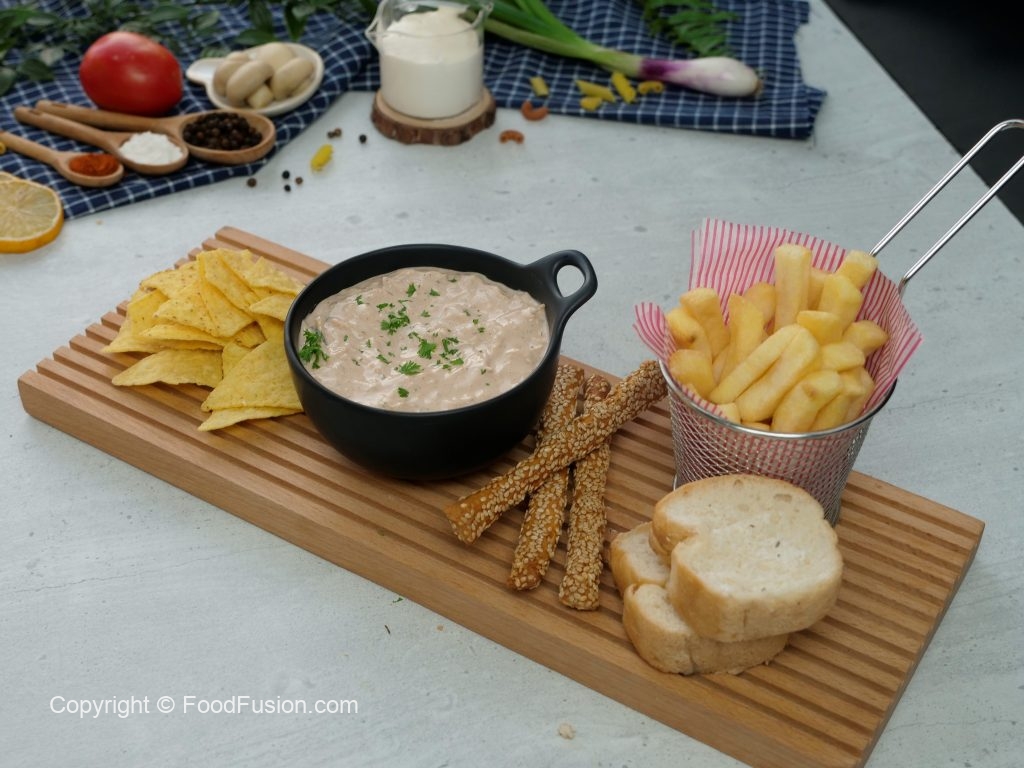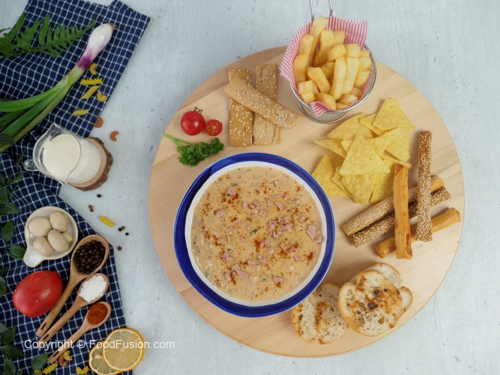Chicken sausages aur paprika powder sa garnish ker lein,garlic bread,French fries,crackers and nachos ka saath serve karein.