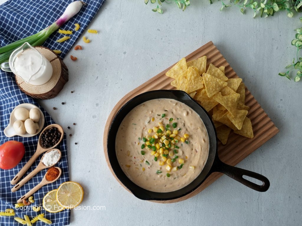 Corn kernels aur hara pyaz leaves sa garnish ker lein aur appetizers,nachos,crackers, snack items & pita (toasted) ka saath serve karein.