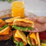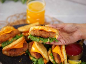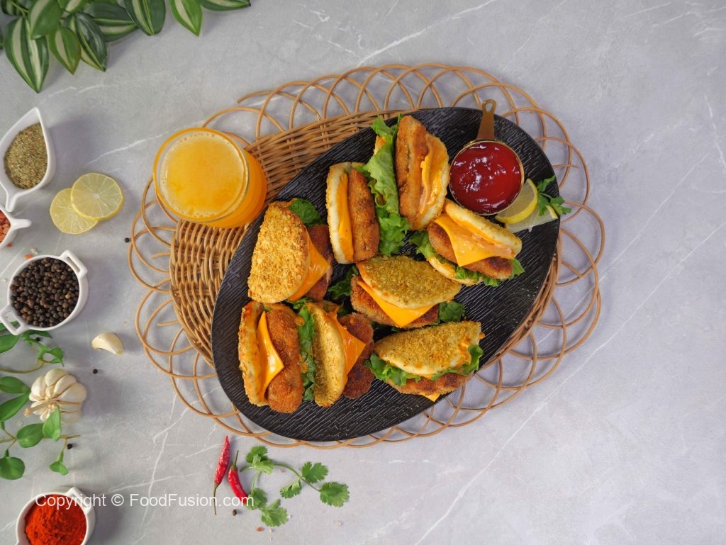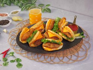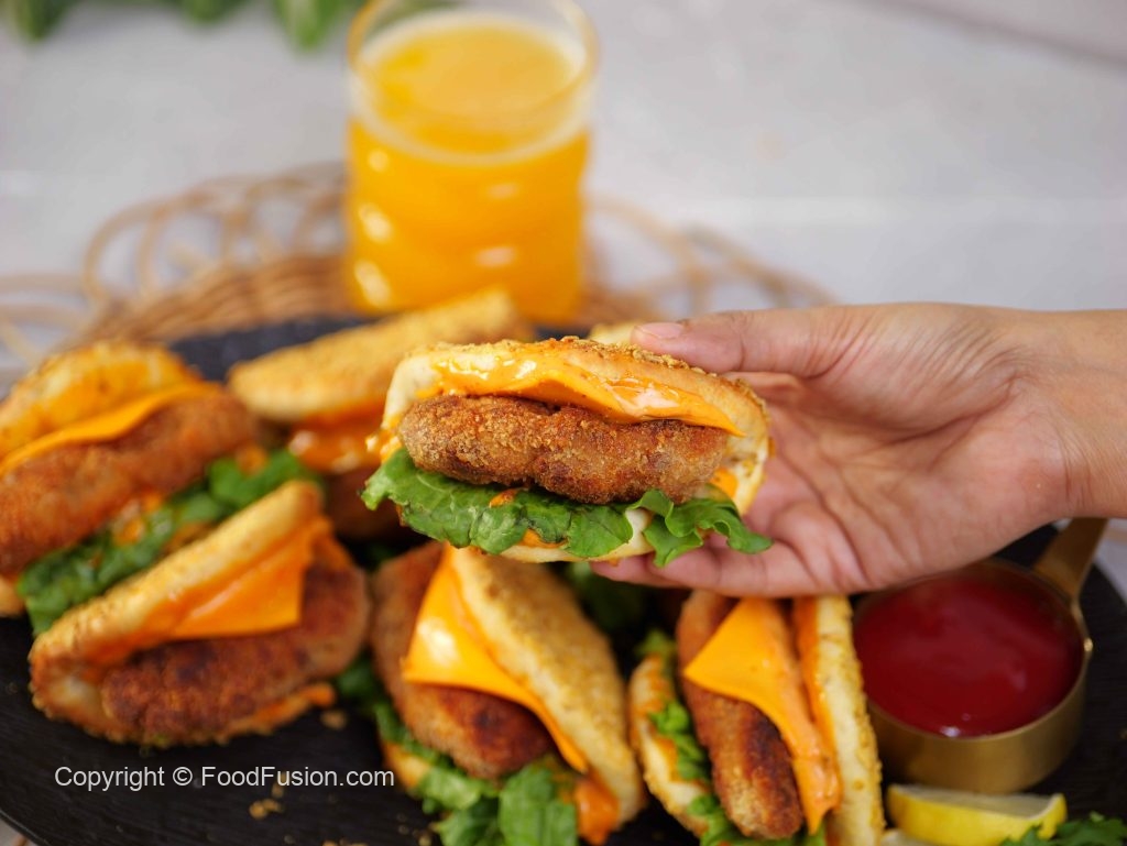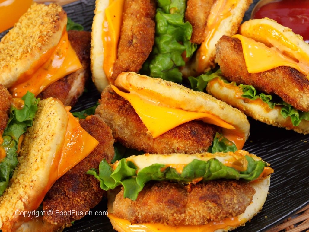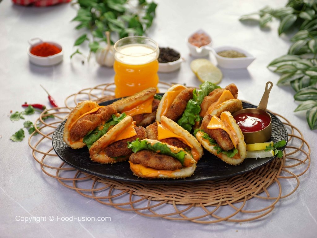 -Buns par prepared sauce spread karein, salad leaf rakhein, crispy chicken, cheese slice aur phir thoda aur sauce daal kar serve karein (makes 14).