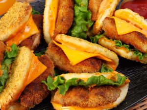 -On buns,add & spread prepared sauce, place salad leaf,crispy chicken,cheese slice,prepared sauce & serve (makes 14).