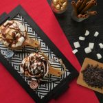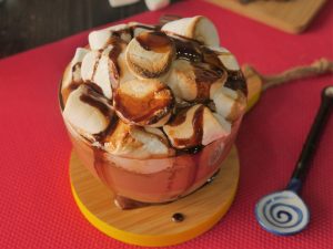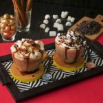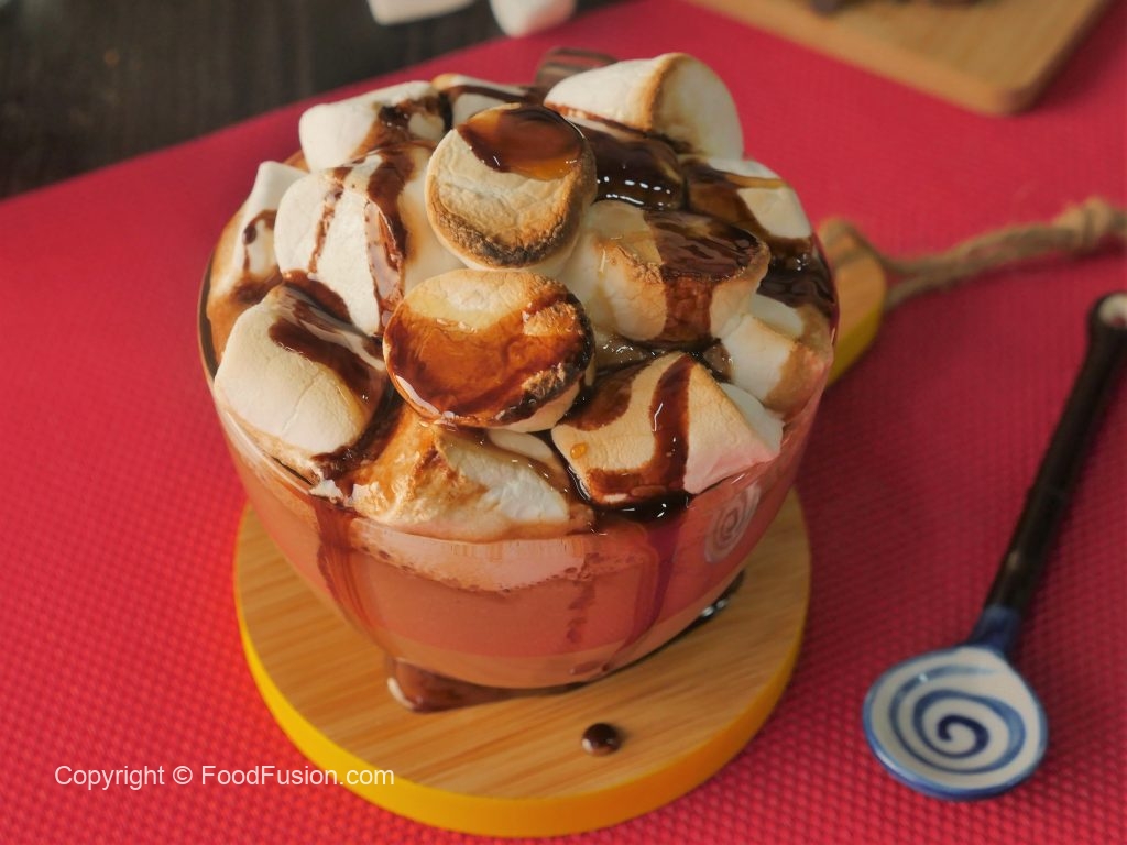 Serving cup mein caramel hot chocolate aur marshmallows dal dein aur blow torch ki madad sa burn ker lein.