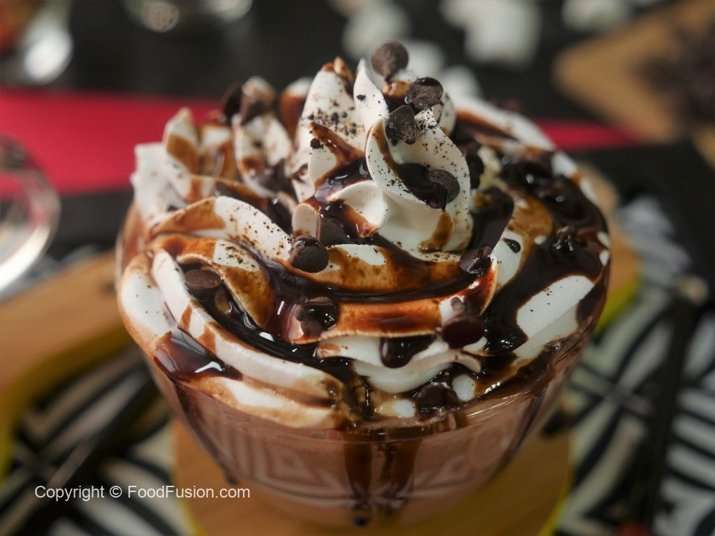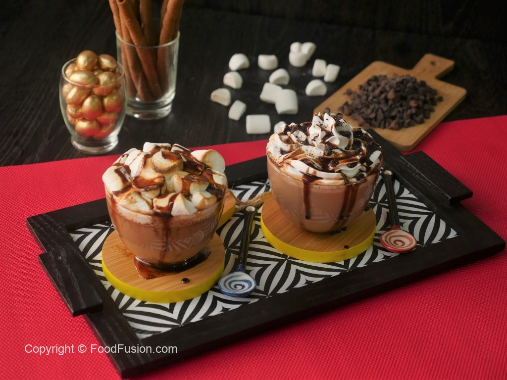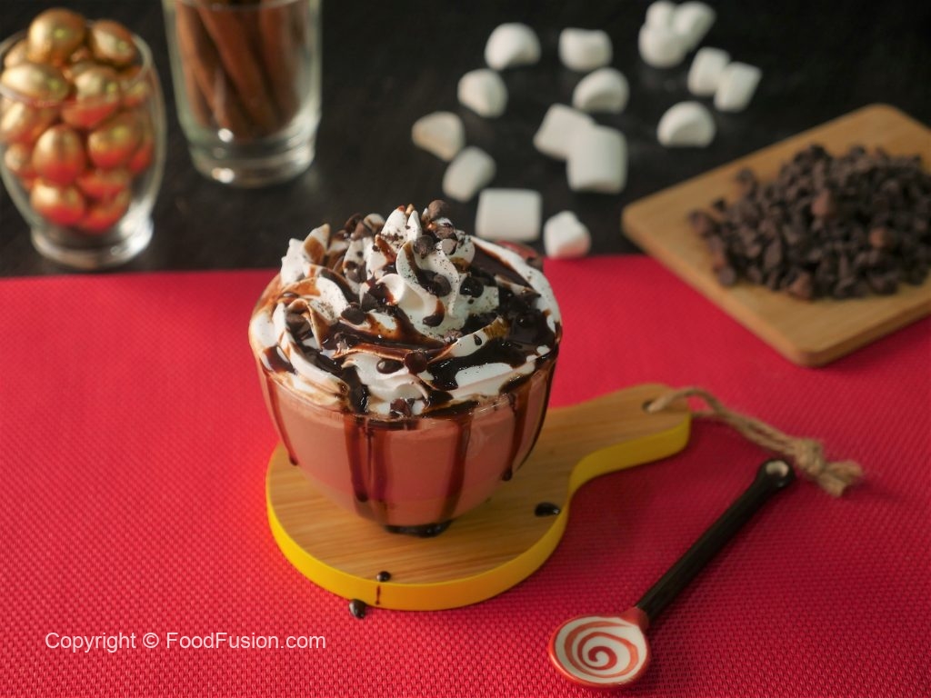 In serving cup,add nutella hot chocolate,whipped cream,chocolate chips,chocolate syrup and sprinkle cocoa powder & serve!
