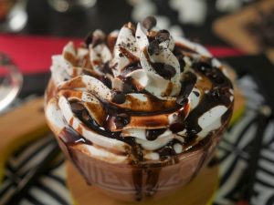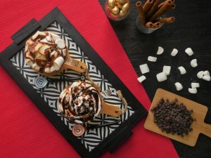 Chocolate syrup aur caramel syrup dal ker serve karein!