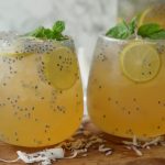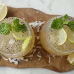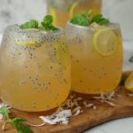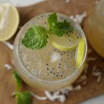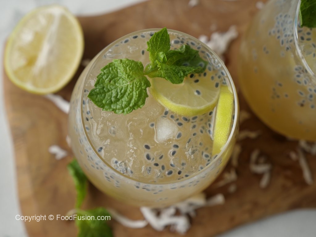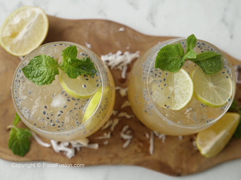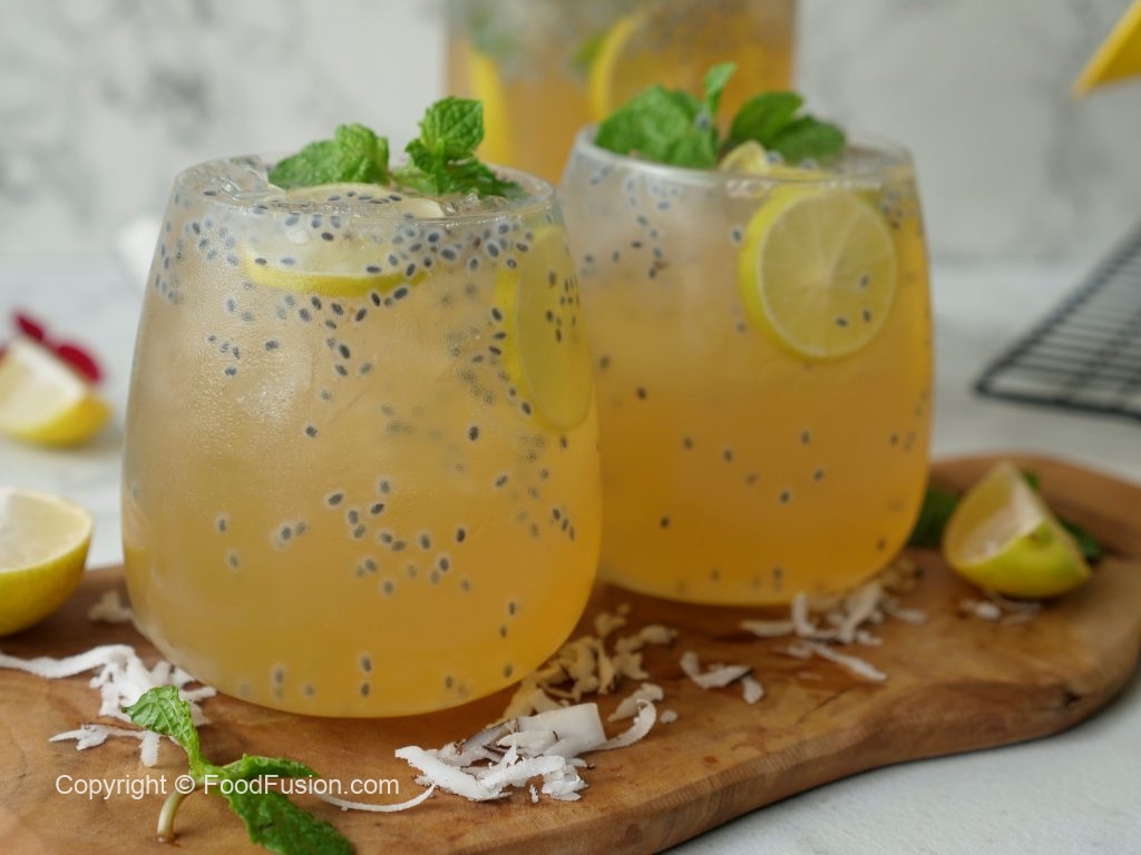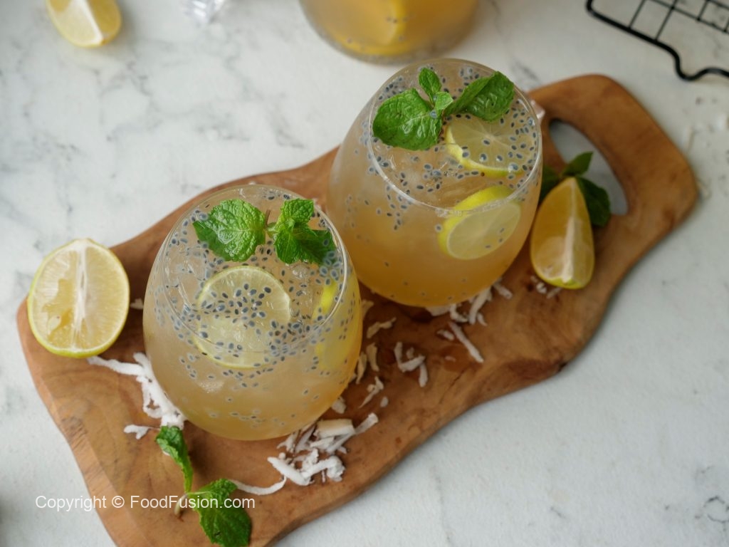 In a serving glass,add crushed ice,lemon slices,soaked basil seeds,prepared coconut nut iced tea & serve!