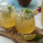 Serving glass mein crushed ice,lemon slices,soaked tukhme Balanga aur tayyar coconut nut iced tea dal dal dein & serve karein!